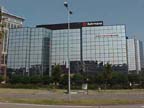 two reflective glass towers about 12-stories tall. One has the